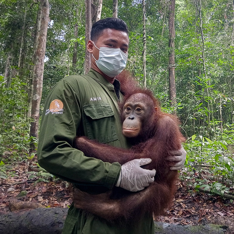 Image Below: Orangutan carer, Amir, taking Charlotte out into the forest for a Jungle School lesson.