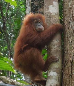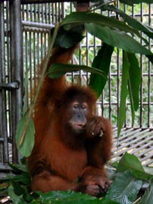 Enrichment was given twice daily, different each time. Leaves were given twice a day, at noon for playing and late afternoon for nesting. He regularly goes to jungle school once a week for minimal. Now he is at Open Orangutan Sanctuary (OOS) in small socialisation cage. Very healthy and had no illness since came to OOS. Jarot is very shy and independent. His cage-mate was changed almost every week to improve his socialisation skill, but he doesn't seem make good friend with other except Veny whom he comfortable with.