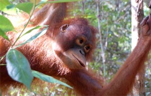 Lidya is the great spitter – her accuracy and spitting distance are amazing. Until she gets out of her sleeping enclosure and is in the forest, Lidya is the terror of the rare visitor who is allowed to visit her camp. What Lidya particularly enjoys is spending time exploring the forest. When she goes out to the forest in the morning, she starts out by climbing into the canopy with some of her orangutan friends. After about half an hour of social time, she will sneak off to climb on her own. Lidya is a bit of a daredevil. She finds the tallest tree in the forest and climbs to the top. Once there, she builds a nest using the biggest branches available. If it rains while Lidya is in her nest, she will refuse to leave and return to her caregiver. Using branches as cover, she will wait out the rain while her soggy caregiver waits for her below. With her strong forest skills and rebellious streak, Lidya will soon be a great candidate for release.