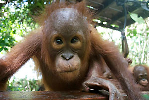Sometimes we'll have food items that not all the babies like too much, but Rahayu always finishes every piece she gets a hold of. Although she suffered from severe cerebral malaria when she arrived at IAR in April 2011, there is not much to indicate negative effects of her past today. Her eyesight was probably permanently damaged by the malaria infection and she has a slight strabismus on both eyes as well as some minor coordination problems. Fortunately she is not one to let things like this get in her daily routines, and is always looking for new ways to tease some of the younger babies and does not give up enrichment items or food very easily. This is something our youngest baby, Gunung, has experienced quite a few times. Rahayu loves pulling his legs or hair (Gunung has very long, pull-inviting hair) until he bravely cries for the help of the babysitter. When she is not picking on Gunung; she prefers to play on her own – always not too far away from the babysitter. She likes to stay up high in the platforms or trees in the playground and when she is up high you would not expect that she has such impaired eyesight. Another sign that she is doing well is that she has not been ill since she recovered from her malaria infection last year, and that is good news for when we move to our new and bigger centre this year. There we have prepared a large forest area where the babies and juveniles can jump from tree to tree, build their nests high up and have even more limited contact with humans. Hopefully Rahayu will cope well with this transition and her slight handicap won't hinder her too much in the new forest.