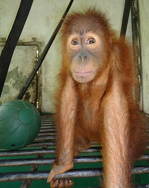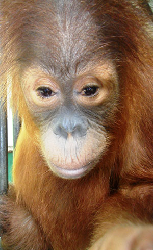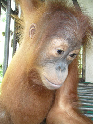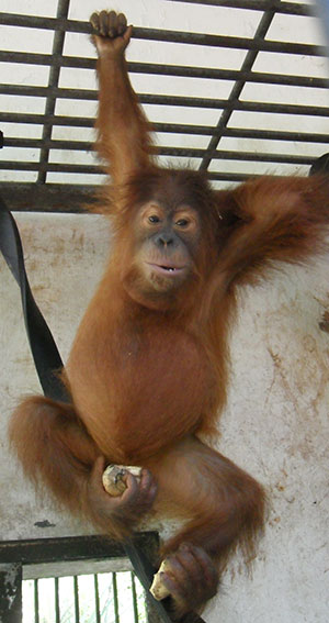 Chocolate was in an isolation cage by himself for a while after his companion Rahul became ill and had to be housed at the clinic. Chocolate is now housed with an orangutan named Hutan and they get along well. If they are given coconuts then they will work together to open them.