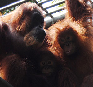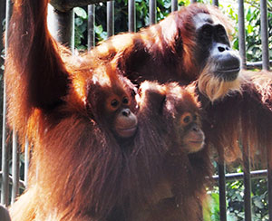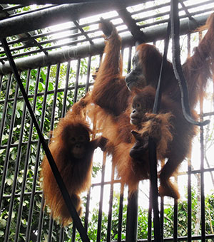 Ganteng has grown into a very active and curious young orangutan. He likes to play away from his mum Gober. However he will quickly return to his mum if people he is not familiar with approach the cage. He will also make the typical orangutan kiss-squeak noise when he feels uncomfortable. Recently, Ganteng had a tantrum when some long-tailed macaques from the nearby forest approached the cage. He kiss-squeaked and banged the swing in the cage to show his disapproval at the uninvited visitors. Ganteng is also a curious orangutan and shows great interest in new enrichment that is given such as whole coconuts.