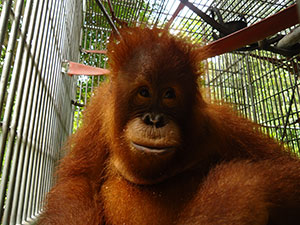 Ugo is a very healthy and active orangutan. He loves to swing and jump into his hammock from the cage ceiling. He has fallen a couple of times but this doesn’t stop the adventurous Ugo! Ugo is the dominant orangutan in his social group. He likes to tease other orangutans and often plays chasing games with them. He also still demands attention from the technicians and he will spit at them if he feels ignored.