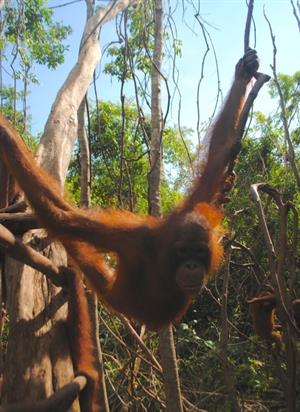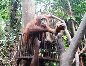 She travels high in the canopy, but her inquisitive nature often draws her over to areas where she causes mayhem. Bunga will appear at the socialisation cages where the older orangutans are housed and tease them through the bars. She has also ventured to areas where contractors are working to see what mischief she can cause. Bunga can be lured away with bananas - her favourite fruit and she will then rejoin the other orangutans back in forest school.