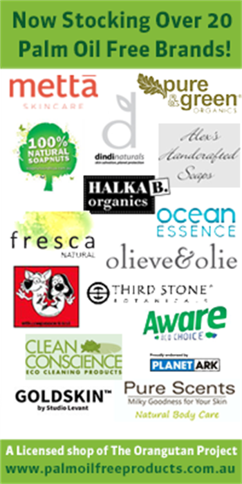 At Palm Oil Free Products we search Australia for products made without nasty chemicals and, most importantly, without palm oil or palm oil derivatives. What we found were the most beautiful products made by small producers using the best Australian ingredients - including award-winning skincare products. All suppliers and their product ranges are free of palm oil removing the guesswork and detective work from your online shopping experience. Palm Oil Free Products is a licensed shop of The Orangutan Project. A minimum of 5%, and up to 15%, of every sale is donated to The Orangutan Project.