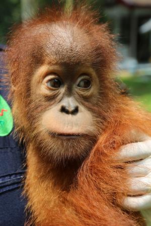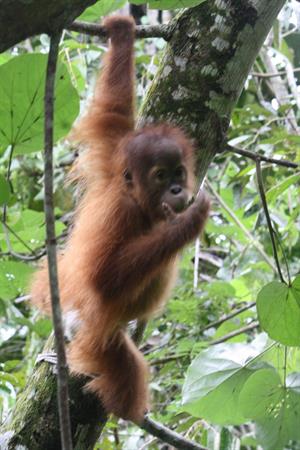 Gokong is developing his climbing skills and loves to play and climb in the trees. However Gokong has had some falls since he has not yet learnt which branches are safe to climb on. He will sometimes use dry branches that break rather than the greener, strong branches. Despite his spills, Gokong is not afraid to climb back up and try again after having a reassuring cuddle with one of his carers. Baby orangutans learn how to climb from their mothers. Gokong will need to learn from the other more advanced orangutans, his baby sitters and from practicing himself.