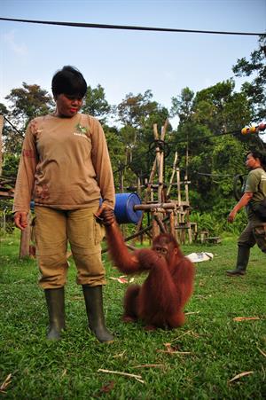 Meki often plays quite far from the supervision of her baby sitters. She goes deep into the forest with her play mates to explore the forest. She also likes to visit the smaller orangutan group and will play wrestle with them. Meki can also be a bit cheeky and steal their food.