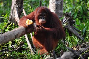 Rosi enjoys climbing and swinging in the canopy. She is a skilled climber and is good at searching for forest food. Rosi likes to eat forest fruits and she also searches for termites to eat. Rosi likes to visit the smaller orangutan group and play with the orangutans in the group. She can be a bit cheeky and sometimes snatches their food.