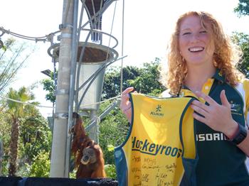 Georgia was excited to take some time out from her busy schedule recently and visit the beautiful Sumatran orangutans at Perth Zoo. There, she met up with TOP Conservation Project Manager Kylie Bullo to give TOP an exciting donation: four team shirts that have been signed by the Hockeyroos team. The Hockeyroos have had an amazing year, coming second at the World Cup and taking out the gold medal at the Commonwealth Games.