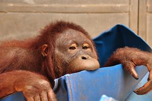 Carmen was transported to Kaja island along with her orangutan friends Bella, Suma and Nanda. The orangutans had to be sedated and placed in transport crates for their journey to the island.