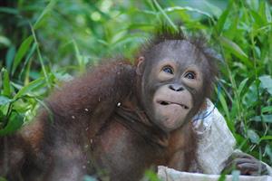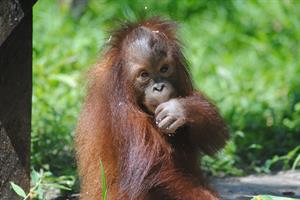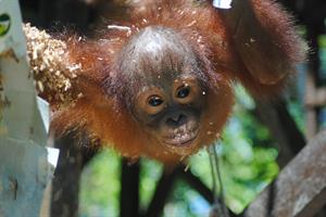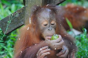 Rickina Is also making improvements since baby school moved into the large fenced forest enclosure, however, she still spends a lot of her time on the ground. To encourage her to climb more, the carers always hang her food and enrichment high in the trees or on the tall tower. However, she is a clever girl and knows that when the others in her group go up for their treats, a lot of the goodies fall to the ground and then she can eat them! As Rocky is now a lot bigger than Rickina she finds his games are getting a bit rough. She prefers the more gentle play sessions with Pelangi, Temon and Marie. We hope that Rickina will soon copy the great climbing skills of her playmates.