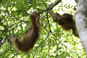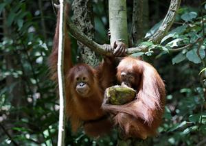 Ganteng still spends the nights in the pre-release cages with a female orangutan named Locky. Staff monitor Ganteng in the forest very closely and record observations on him.
