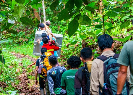 The IAR permanent reintroduction site is located within the borders of Bukit Baka Bukit Raya National Park and has been has been fully operational since January 2016, during which time 19 rehabilitated orangutan have been released. This National Park covers a total area of 181,000 ha of mostly pristine primary forest with a small wild orangutan population present that can be reinforced with reintroductions from orangutans undergoing rehabilitation at the West Kalimantan centre and translocations of wild orangutans. It is a long trek to reach the release site- it takes around 36 to 52 hours depending on the condition of the road. We are sure this journey will be well worth it for beautiful Bunga when freedom awaits her!