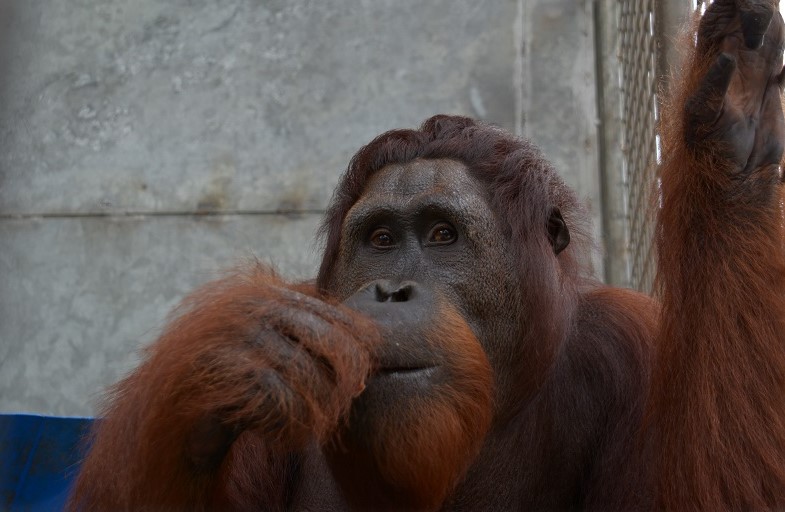 Carlos is a very handsome orangutan and has a laidback personality. He pays close attention to the technicians that provide the food and enrichment to the orangutans in the enclosures. He is not a fussy eater and will eat everything given to him. One of his favourite things to eat is a Vitamin C supplement that is poured into an enrichment log that is perforated with holes for foraging.