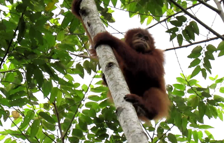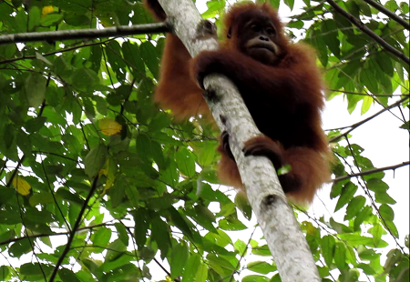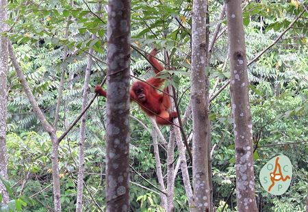 Gokong has since begun spending a lot more time up in the trees. He is learning how to move from one tree to the next by grasping the branches, swinging, or bending the tree, instead of jumping or going down to the ground to get to the next tree. He has also started following another orangutan named Keumala, in the very high Artocarpus sp trees in one of the on-site forest school areas.