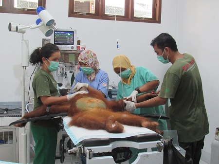 In July 2018, veterinary surgeon Dr. Diah Pawitri from Bogor Agricultural University (IPB) in Java flew to Sumatra to help conduct a special surgery on Seroja together with SOCP vets Dr. Yenny and Dr. Meuthya. Surprisingly, the vets found fluid in Seroja’s abdomen that was indicative of a cyst.