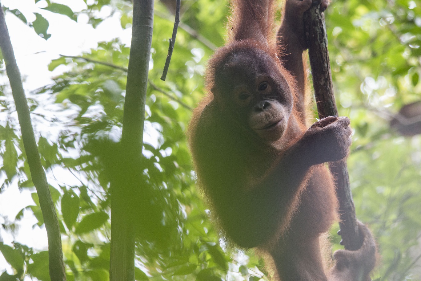 Rocky spends the majority of his day high in the canopy foraging for fruits and leaves and delicious termites. He has now adapted his active period with ‘normal’ orangutan active periods; waking up at sunrise and settling down in his nest at sunset. Overall, Rocky is developing excellent forest skills and is a strong contender for future release.