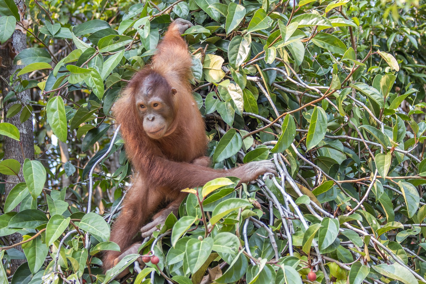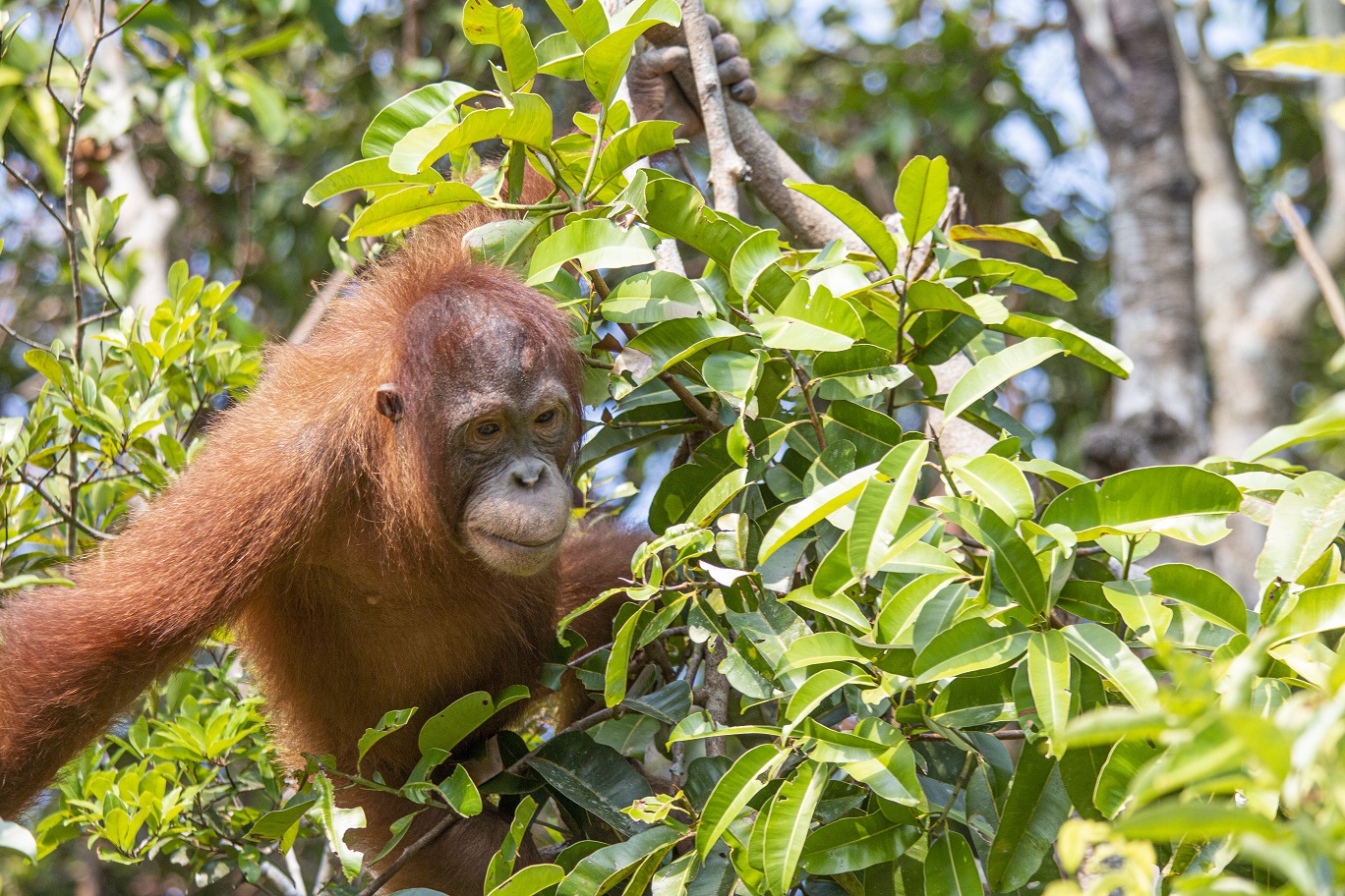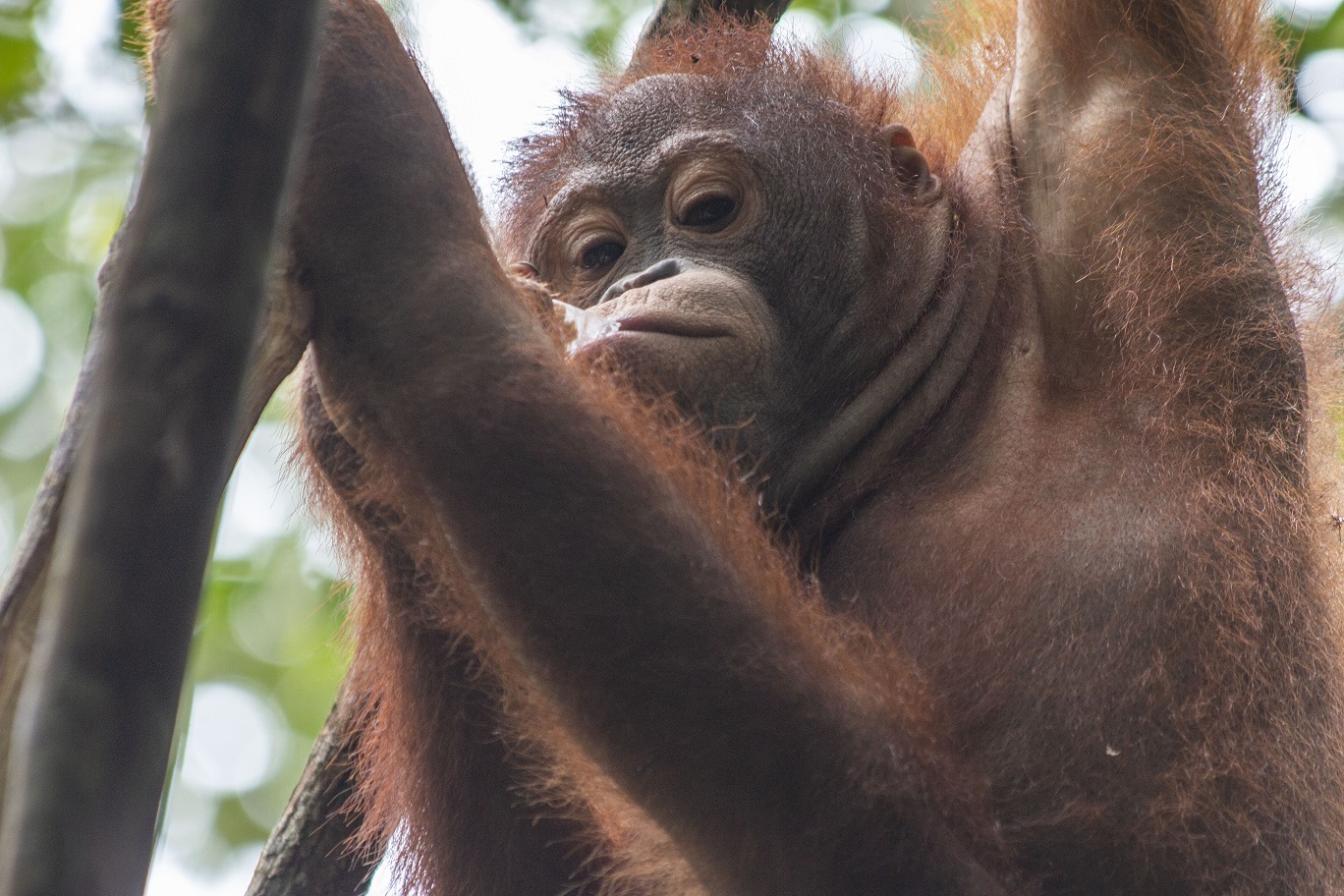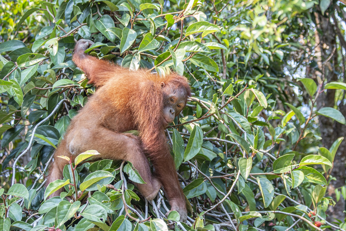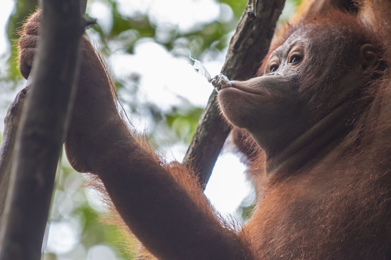 Rickina is a very active and smart orangutan and she utilizes the space and trees on Ali island very well. Even though she still receives supplement food, she has become an amazing forager and seeks out natural fruits, young leaves, shoots and insects. She also has been seen sampling tree bark which is a natural fallback food item for wild orangutans when fruits are scarce.