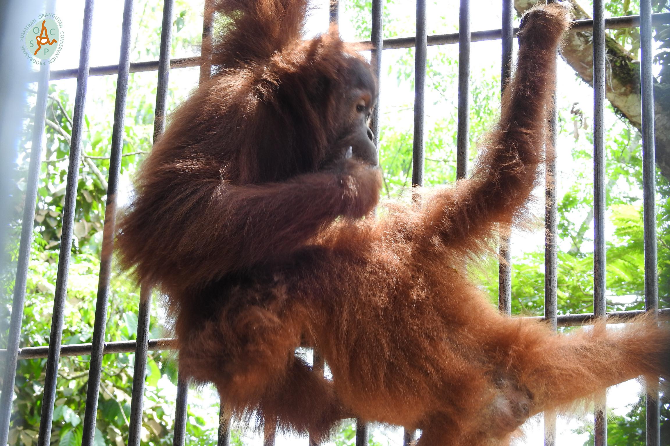 Gokong continues to grow in size and confidence, and he has become even more of a handful at the SOCP Orangutan Quarantine Centre in North Sumatra over the last six months. He is quite aggressive towards the staff and makes it difficult for them to take other orangutans from his group to forest school. Considering this difficult situation, Gokong is on the priority list to be transferred to a reintroduction station, rather than staying longer in the Rescue and Rehabilitation Centre where he cannot attend forest school.