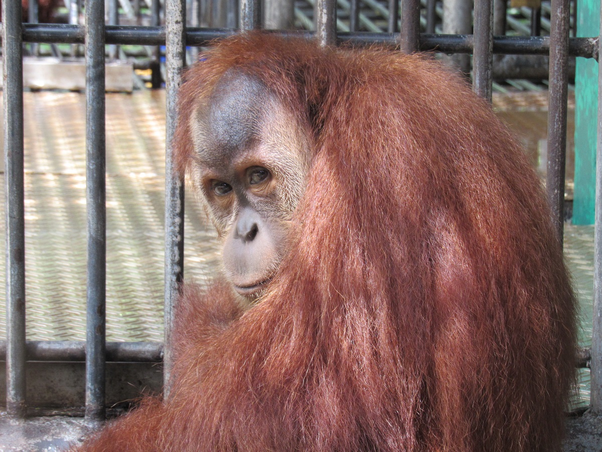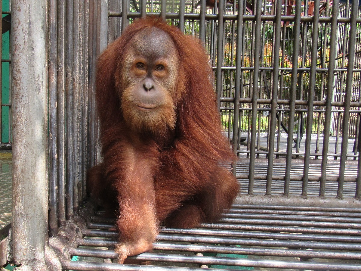 Wow look how Gokong has grown and matured! He has reached that awkward adolescent stage and is developing his beard. Although Gokong is dominant in his group he is not aggressive towards other orangutans in the group. He prefers to play alone rather than join other orangutans. He also does not take food from any other orangutans. Gokong is more aggressive to the staff, especially female staff members, than to orangutans. He will sometimes use the branches and leaves given to the orangutans from the keepers to try and poke the staff or throw the sticks at them! He will also sometimes try and pull on their clothes. Gokong is more interested in human activities around the centre compared to what the other orangutans are up to.