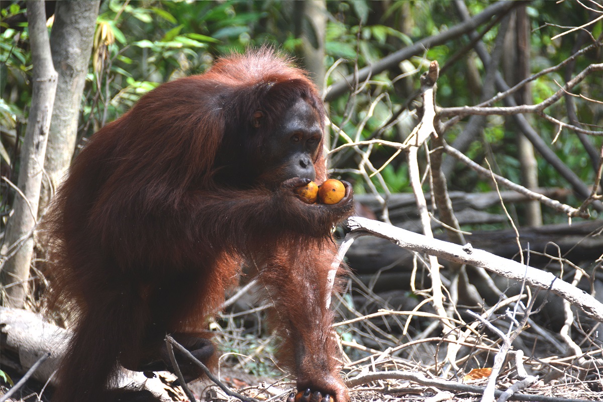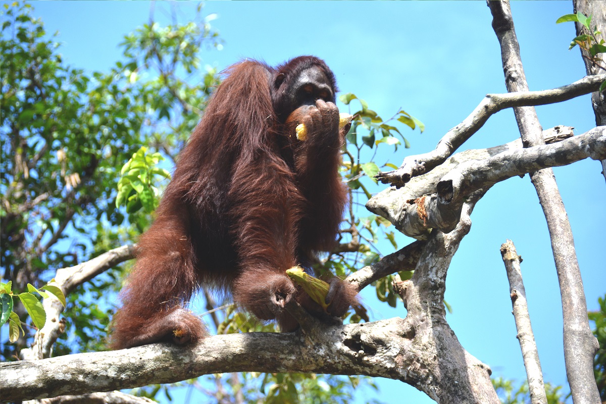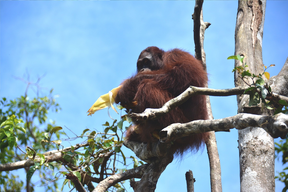 While Wigly still depends on the food provided by the orangutan staff, he is actually a good forager. He has been observed savouring forest fruits, young leaves, and tree bark on the island. The rainy season sprouts many natural food sources on the island, including young leaves, Wigly’s favourite! Young leaves are currently in abundance across the island. Wigly is in good health. He appears to have grown and has long, shiny hair, indicating he is in prime condition.
