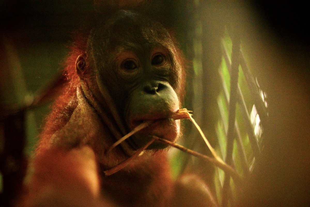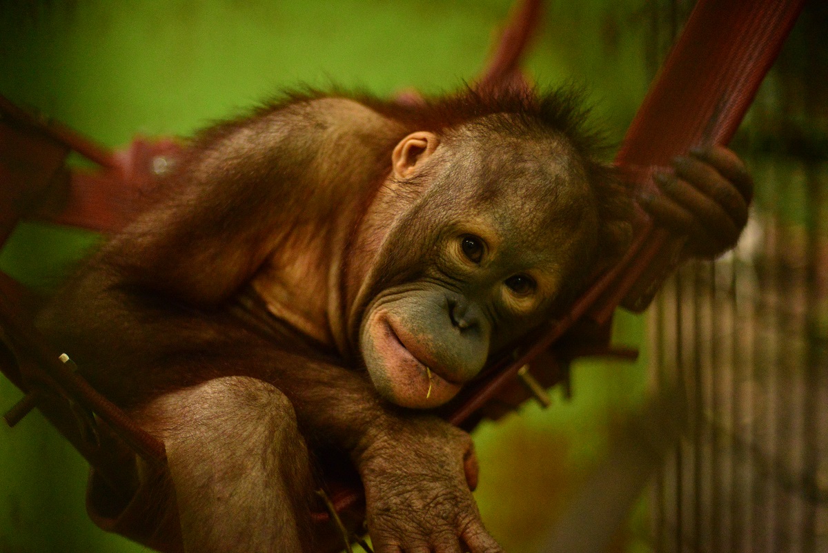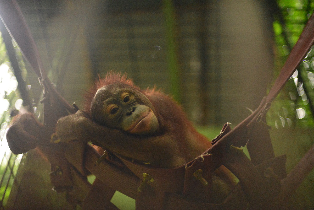 Happi shares an enclosure with three other orangutans and knows how to deal with their different personalities. He will often keep a safe distance from the others to avoid any disagreements over things like food! Happi prefers to observe the other orangutans from up high in his comfortable hammock. Happi has a knack for observing and adapting to new locations. Every time he goes to Jungle School, he is able to explore new areas that he has not visited previously. He is always looking around carefully to see what he can eat or use. Happi has been observed drinking water from a hold in a tree which is an excellent forest skill to have. He will sometimes carry a branch of young leaves around to snack on as he travels around the forest.