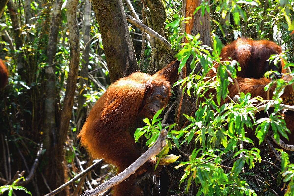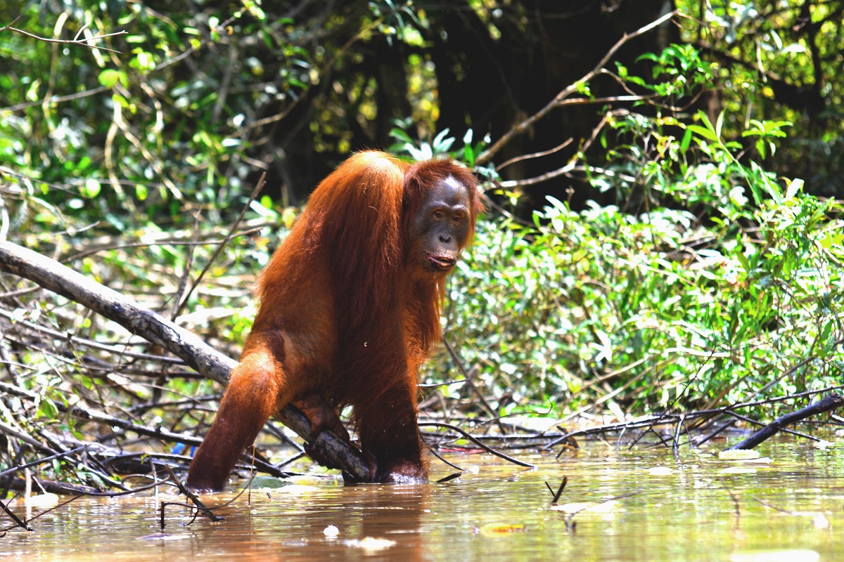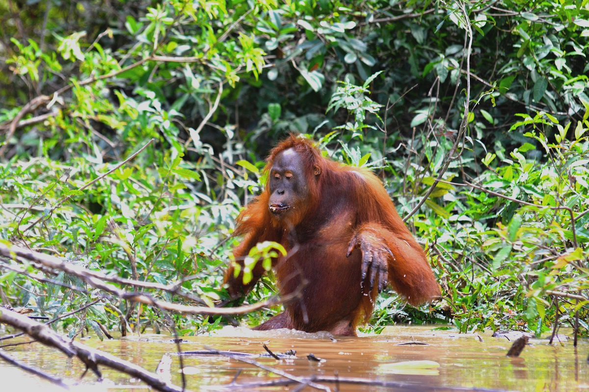 Meki is a long-term member of our adoption family and it is lovely to see her continue to flourish on Kaja Island, one of the BOS Foundation’s pre-release islands in Central Kalimantan. Lately, Meki has spent more time relaxing on the ground than actively exploring her surroundings and moving through the canopy. Her extra time on the forest floor appears to be due to the receding river waters, which have exposed more land on the island and given Meki and her friends the chance to play more on this new and interesting ground or at the feeding platform. The staff are confident that when the waters rise again and cover the land, Meki and the other orangutans will return to exploring the canopy that covers the island.