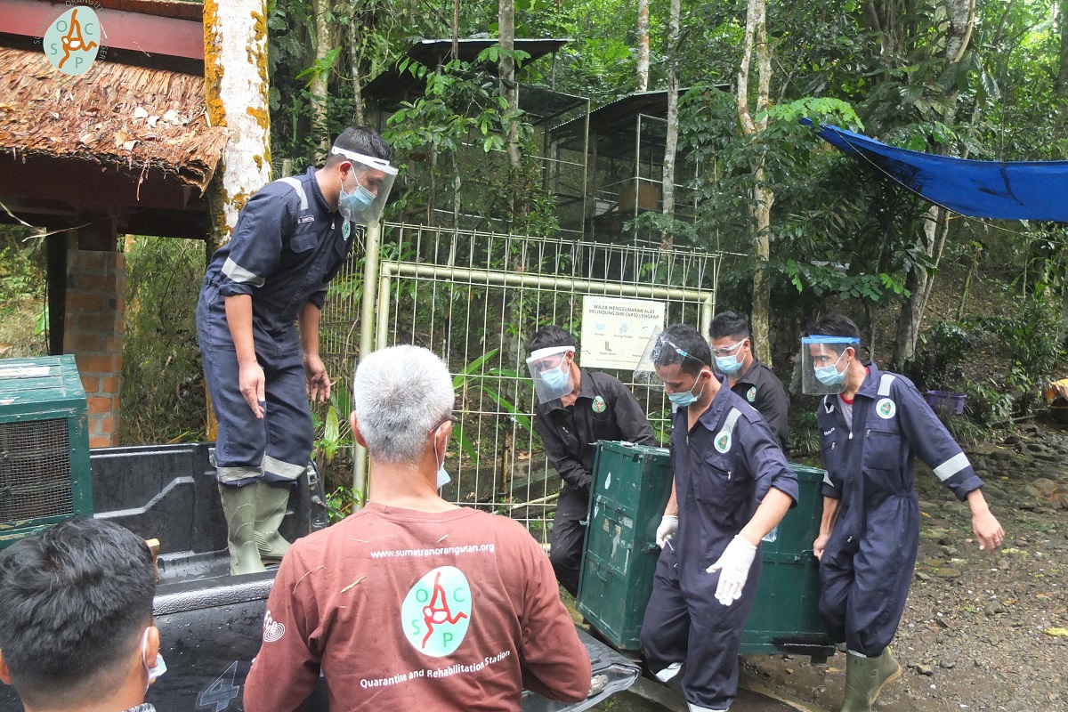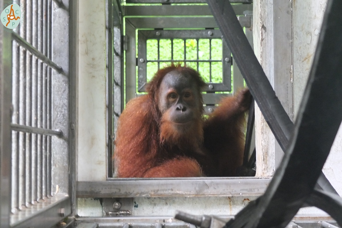 In early June, along with three other orangutans, Gokong undertook the journey to Jantho. Each orangutan had their own transportation cage and were accompanied by SOCP staff including a vet and Animal Manager. The ongoing COVID-19 pandemic impacts all aspects of orangutan care and rehabilitation making situations like transportation to Jantho more challenging and complicated. Some of the measures taken include complete PPE worn at all times when checking on the orangutans in transit and routes altered to avoid stopping in locations where there is a risk of people approaching the transportation cages. The transportation team also encountered heavy rain on the last off road leg of the journey, but all made it to Jantho in good spirits.