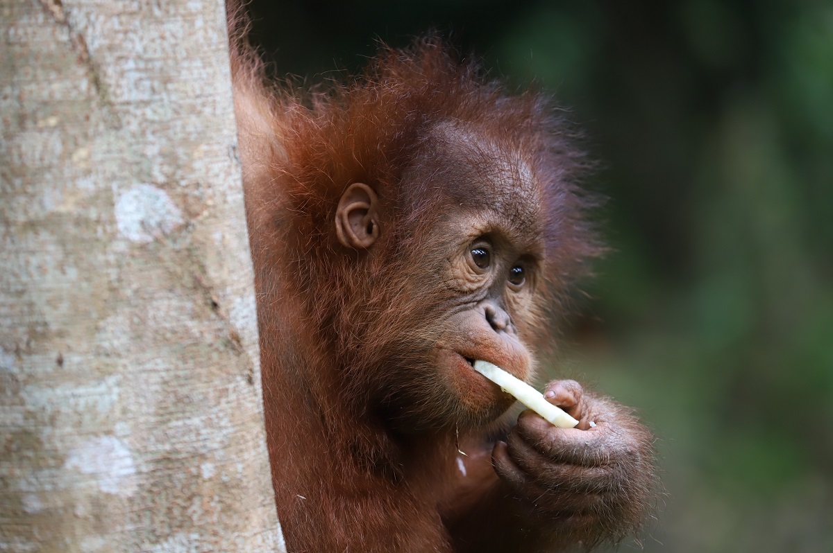Little Sudin and his best friend Siti began Jungle School in February 2022, soon after they arrived at the Orangutan Sanctuary in the Bukit Tigapuluh ecosystem. Sudin is very active and spends much of his time playing with Siti and exploring the forest. He likes to hang from branches with his hands while swinging his legs below.