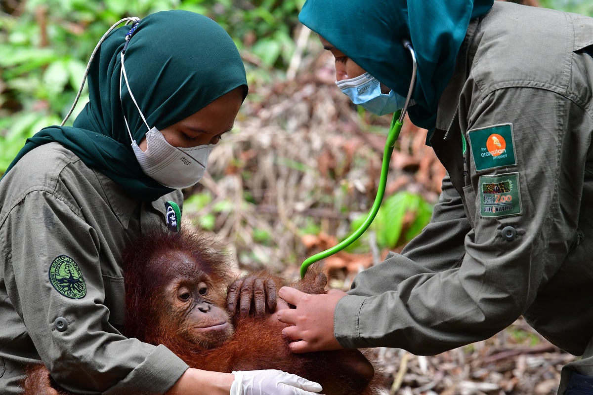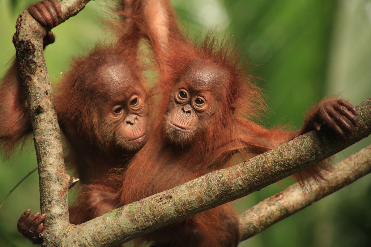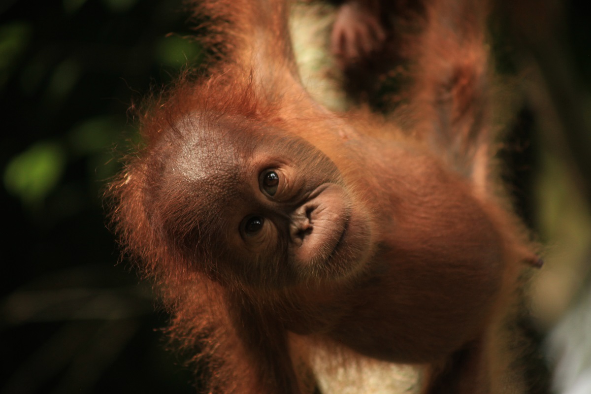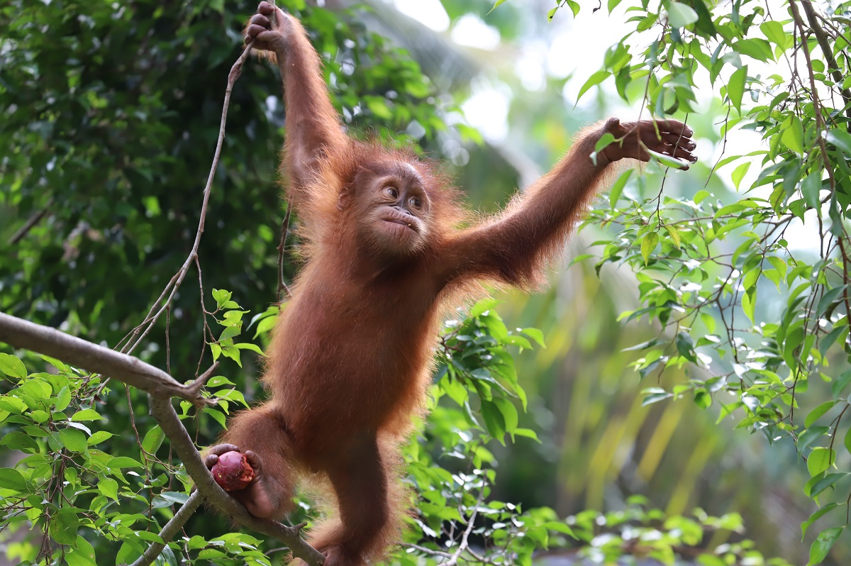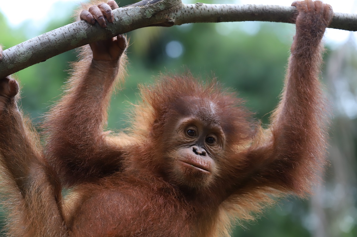 Little Sudin and his best friend Siti began Jungle School in February 2022, soon after they arrived at the Orangutan Sanctuary in the Bukit Tigapuluh ecosystem. Sudin is very active and spends much of his time playing with Siti and exploring the forest. He likes to hang from branches with his hands while swinging his legs below.