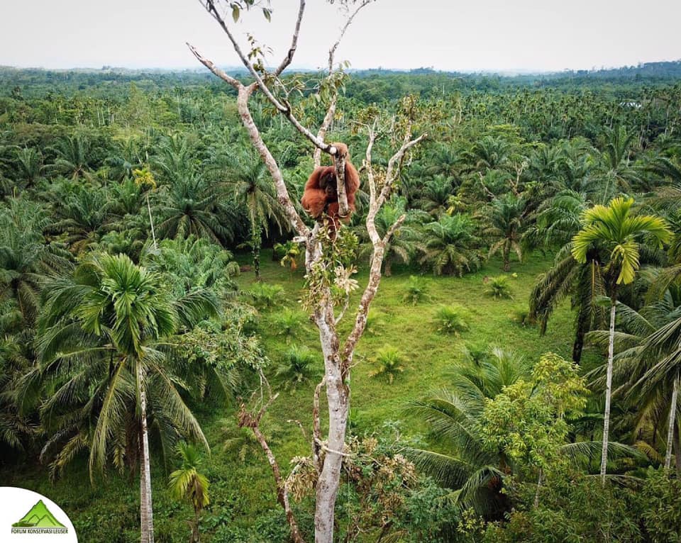 Below you can see an adult orangutan marooned in between an oil palm plantation and a local village near the Leuser Ecosystem. Our partner FKL rescued and translocated him back into the forest.