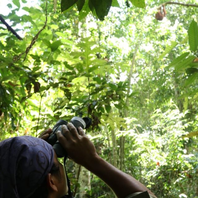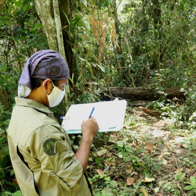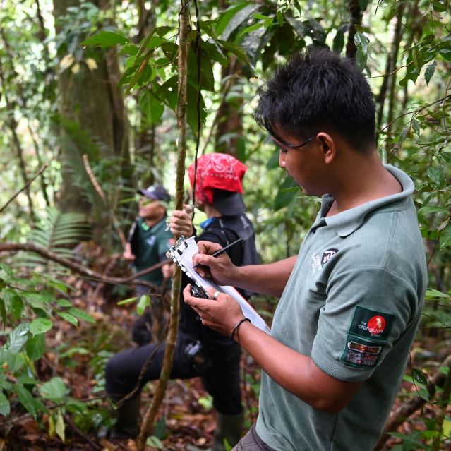 Our work in Bukit Tigapuluh is a project run by our partner Frankfurt Zoological Society and the Indonesian Ministry of Forestry and Environment. You can see photos below of the Wildlife Protection Units hard at work, monitoring orangutans, trekking through the jungle, and taking notes of their monitoring.