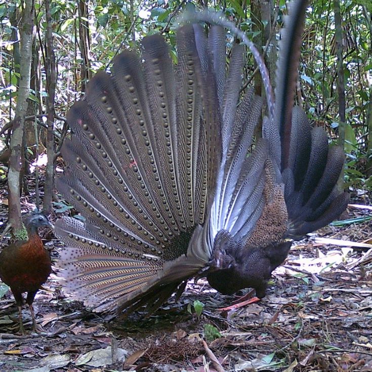 Top row below: Male and female argus pheasant involved in a mating ritual, crested fireback, deer and fawn