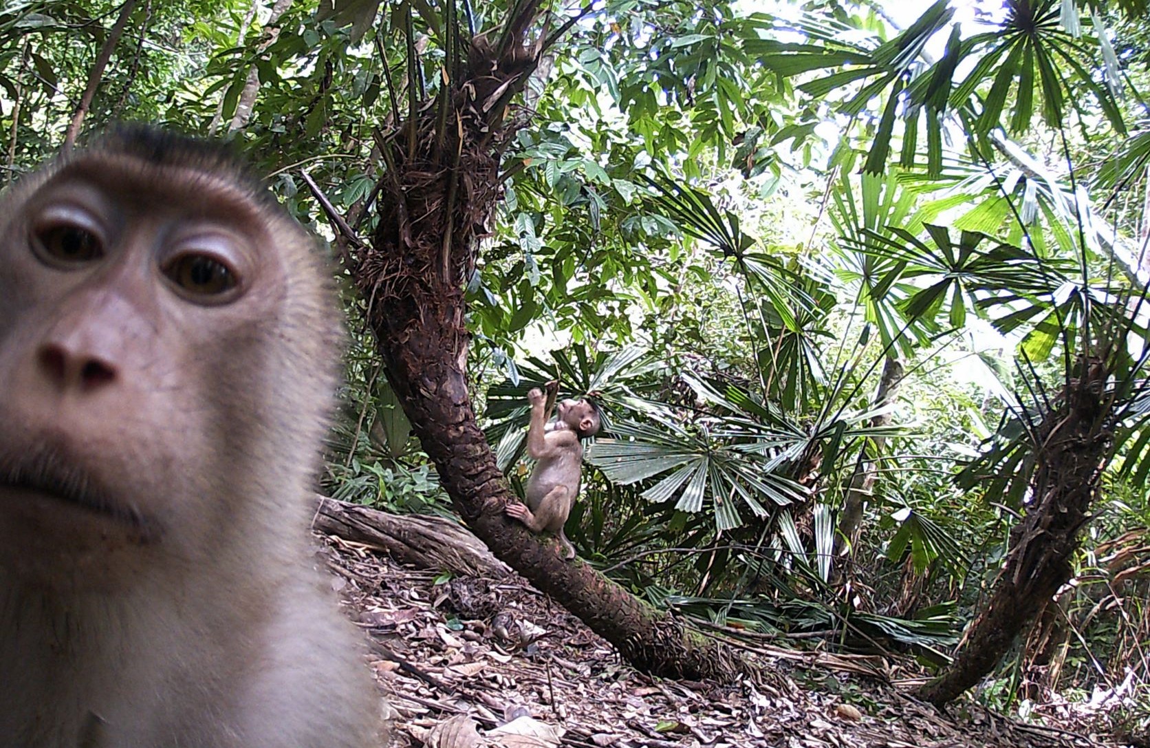 Bottom row below: A family of curious pigtailed macaques, a hornbill, a yellow muntjac
