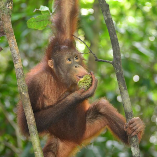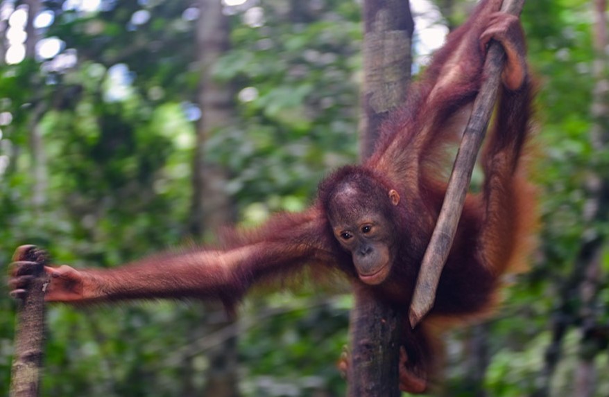 Jungle School is the most important strategy in a rescued orangutan’s development. Carers teach young orphaned orangutans how to forage for fruits, leaves and termites. They encourage baby orangutans to climb trees, placing their hands and feet around slender saplings. They support them as they try to swing through the trees and move their hands across to branches.