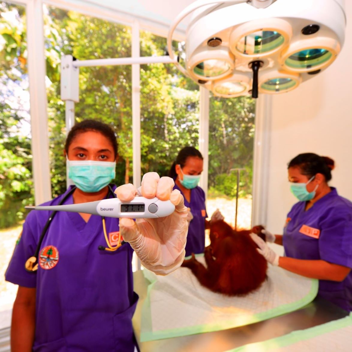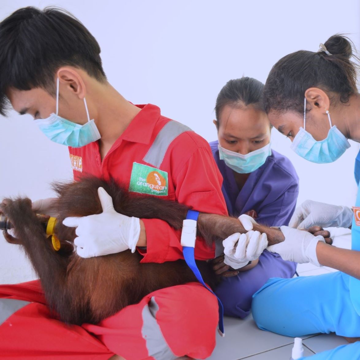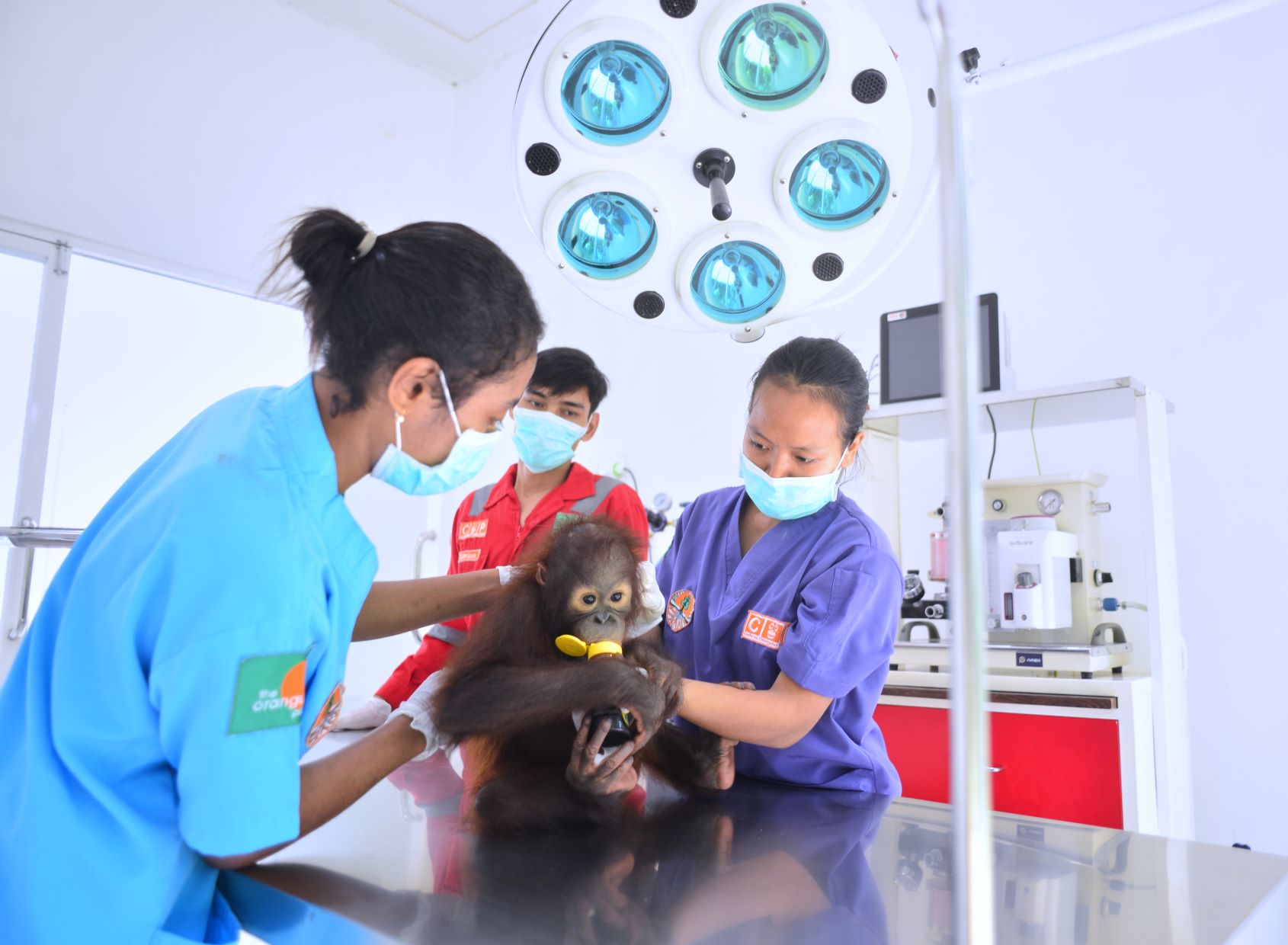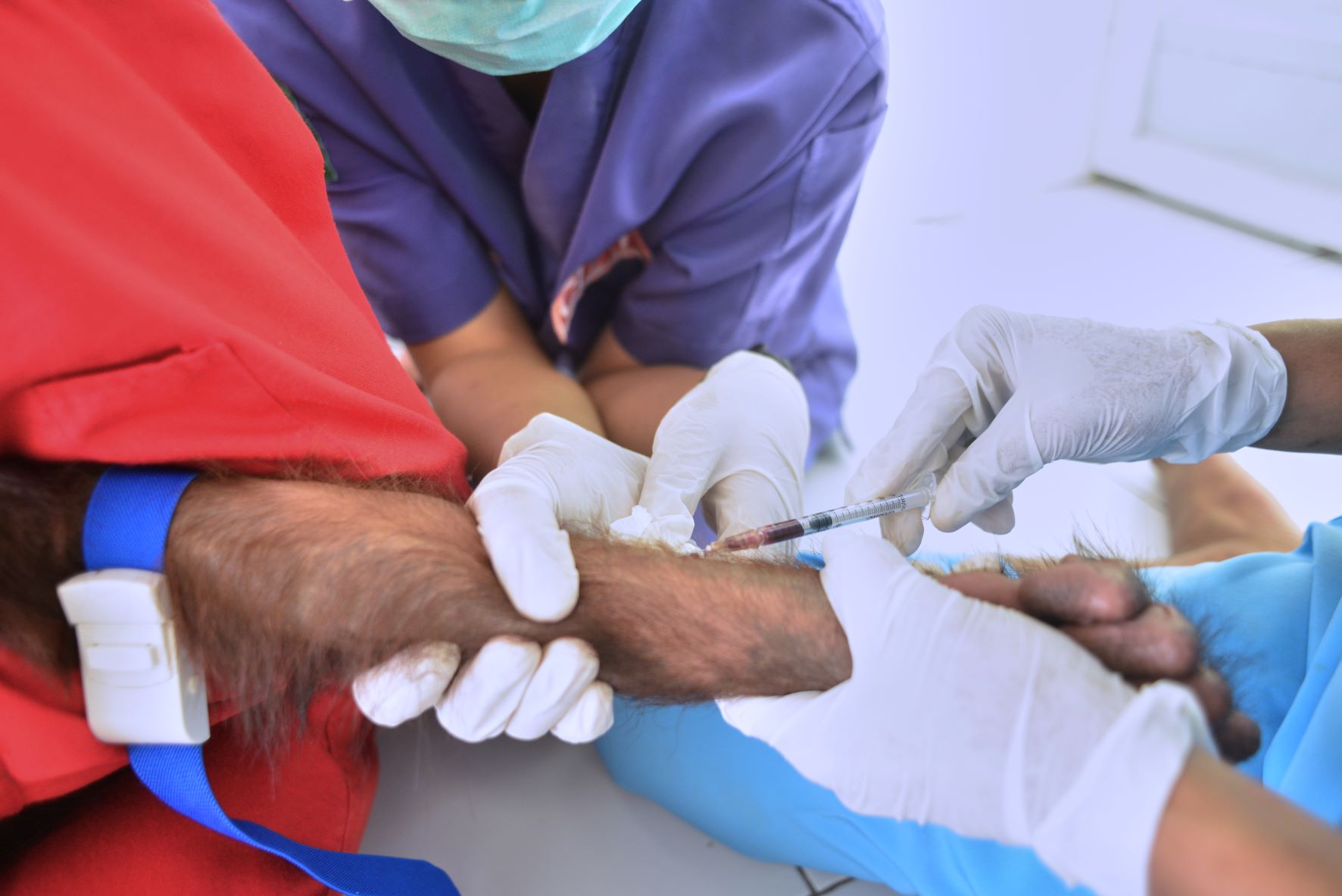 Just like humans, orangutans get sick, have medical issues, and need to have regular check-ups when they are in human care. Rescued orangutans often arrive at our rescue centres with illnesses, injuries and even life-threatening conditions. Over time, with medications, treatment and nutritious food, their health improves and they can leave quarantine and spend time with other orangutans in Jungle School. But the medical care doesn’t stop there.