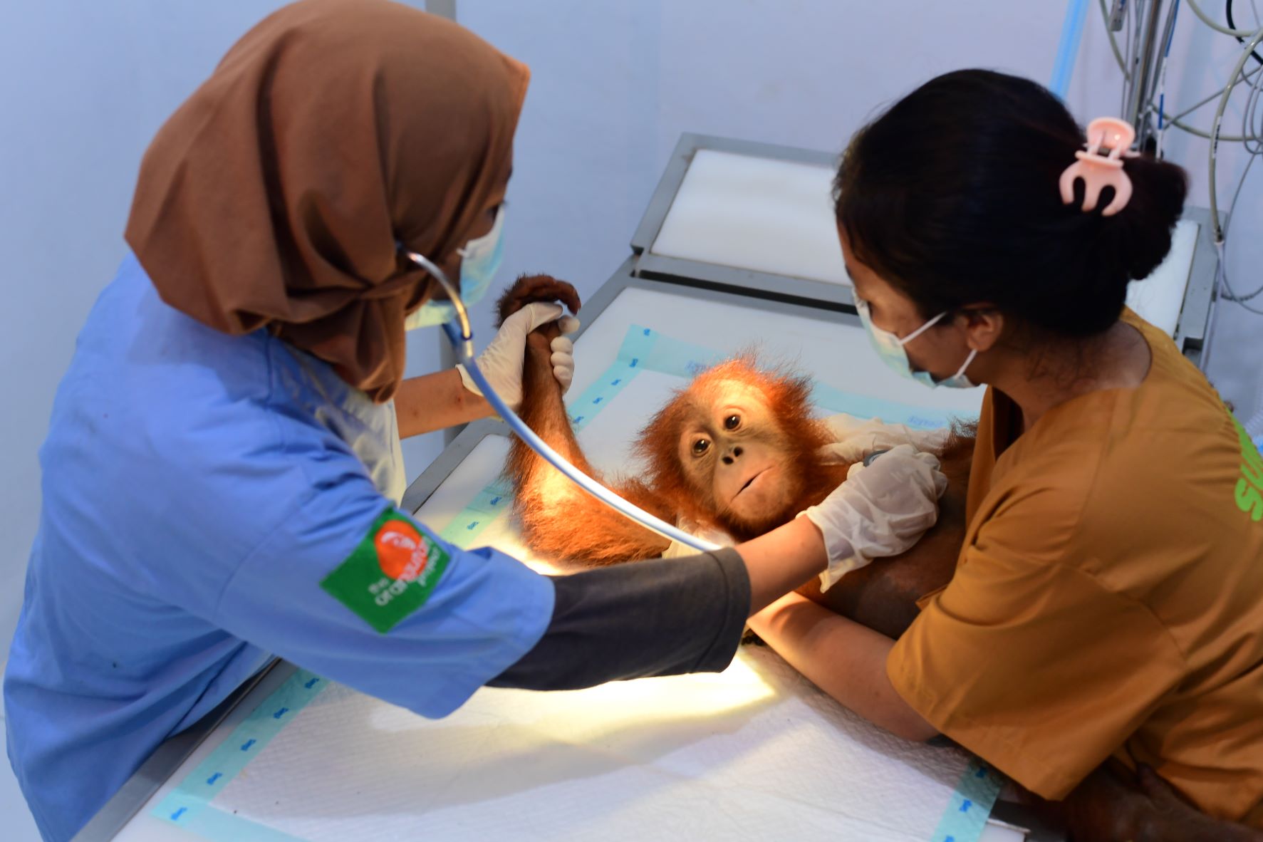 Orangutans can become sick with a wide range of illnesses, including respiratory illnesses, gastro-intestinal diseases, and serious conditions such as tuberculosis and malaria that can be life-threatening. When an orangutan arrives at a rescue centre, they are tested for all these illnesses, as well as for COVID-19, parasitic infections and other diseases. They then go into a standard quarantine period to protect other orangutans at the centre from any contagious diseases they may be carrying.