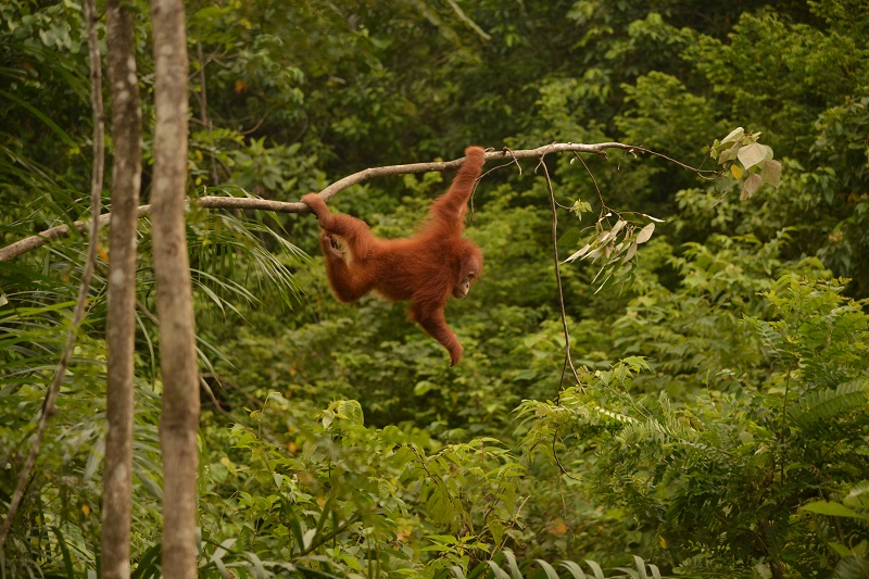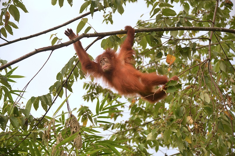 Asto now climbs very high in the canopy and has greatly improved in transferring from one tree to another, even if there are only a few interconnecting branches. She will use her body weight to swing on one branch and move close to the other tree. This is a very important skill that wild orangutans learn and develop over time.