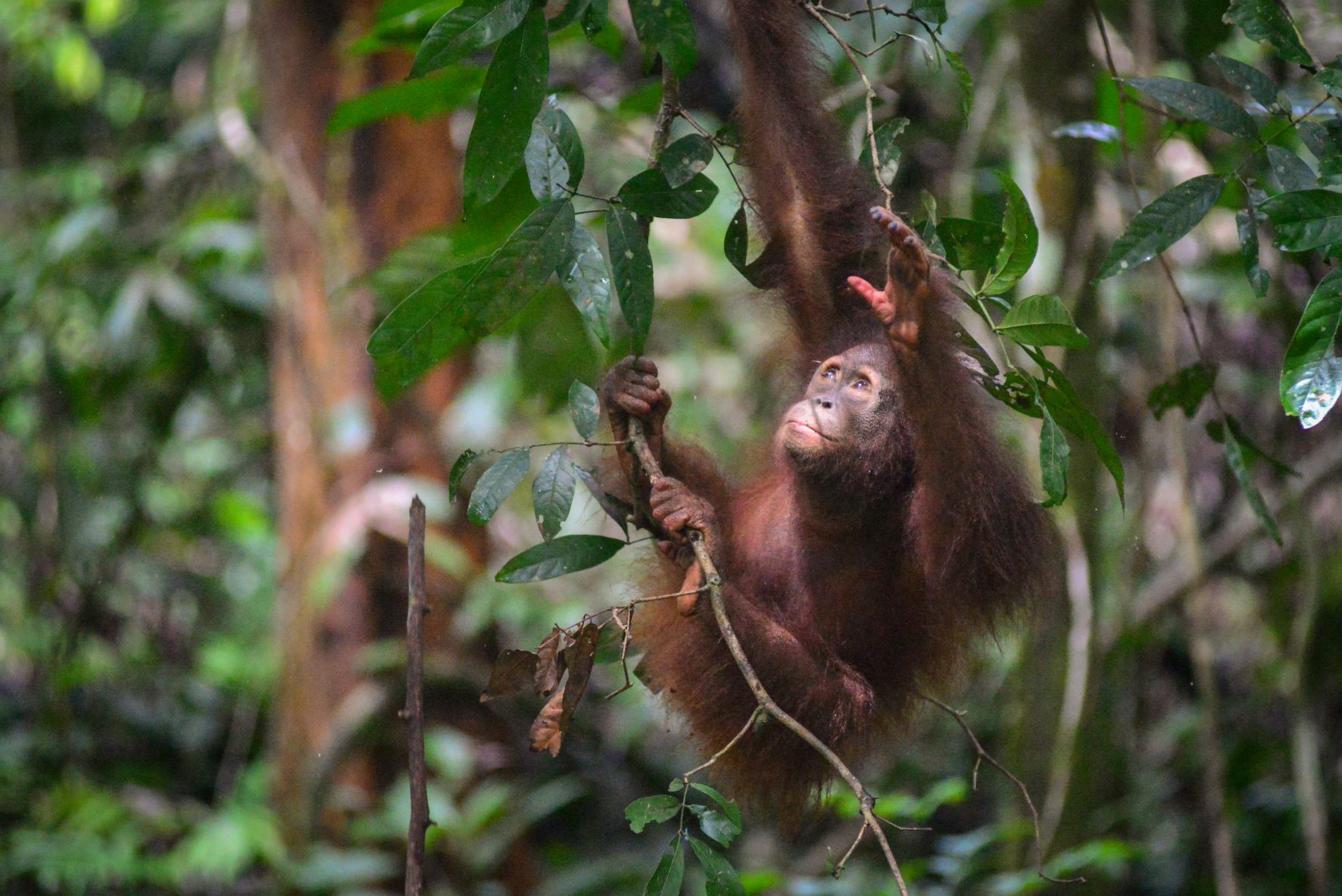 I’ve travelled through the canopy for a while now, and I pause to munch on some figs, liana and cambium inside the twigs. I remember Amir showing me how to strip the bark off with my teeth so I could get to the rich creamy cambium layer underneath. When I first arrived at the centre, they gave me leaves and twigs but I didn’t know what to do with them. I thought they were playthings, so I just sucked the moisture off and let them fall to the ground. I wouldn’t know what to eat without Amir and the others showing me. One day, I’ll need to find all my food on my own.