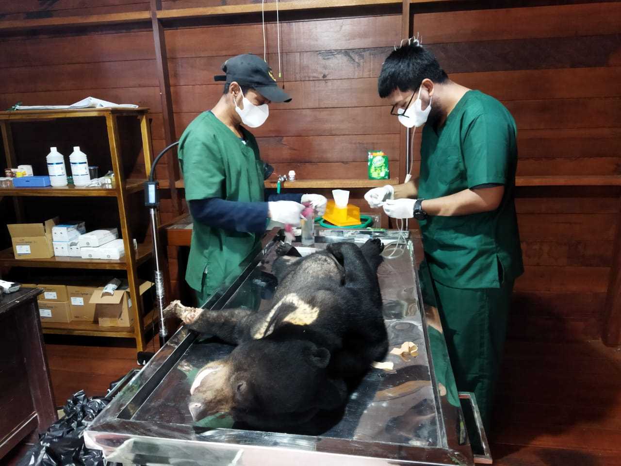 Not long after that, the team received a report of a young female sun bear caught in a snare close to an oil palm plantation. The rescue was so urgent that although it was already night-time, the team travelled to the site to rescue the bear. Judging by the wound, they thought the bear had been in the trap for at least three days as her foot was badly damaged.