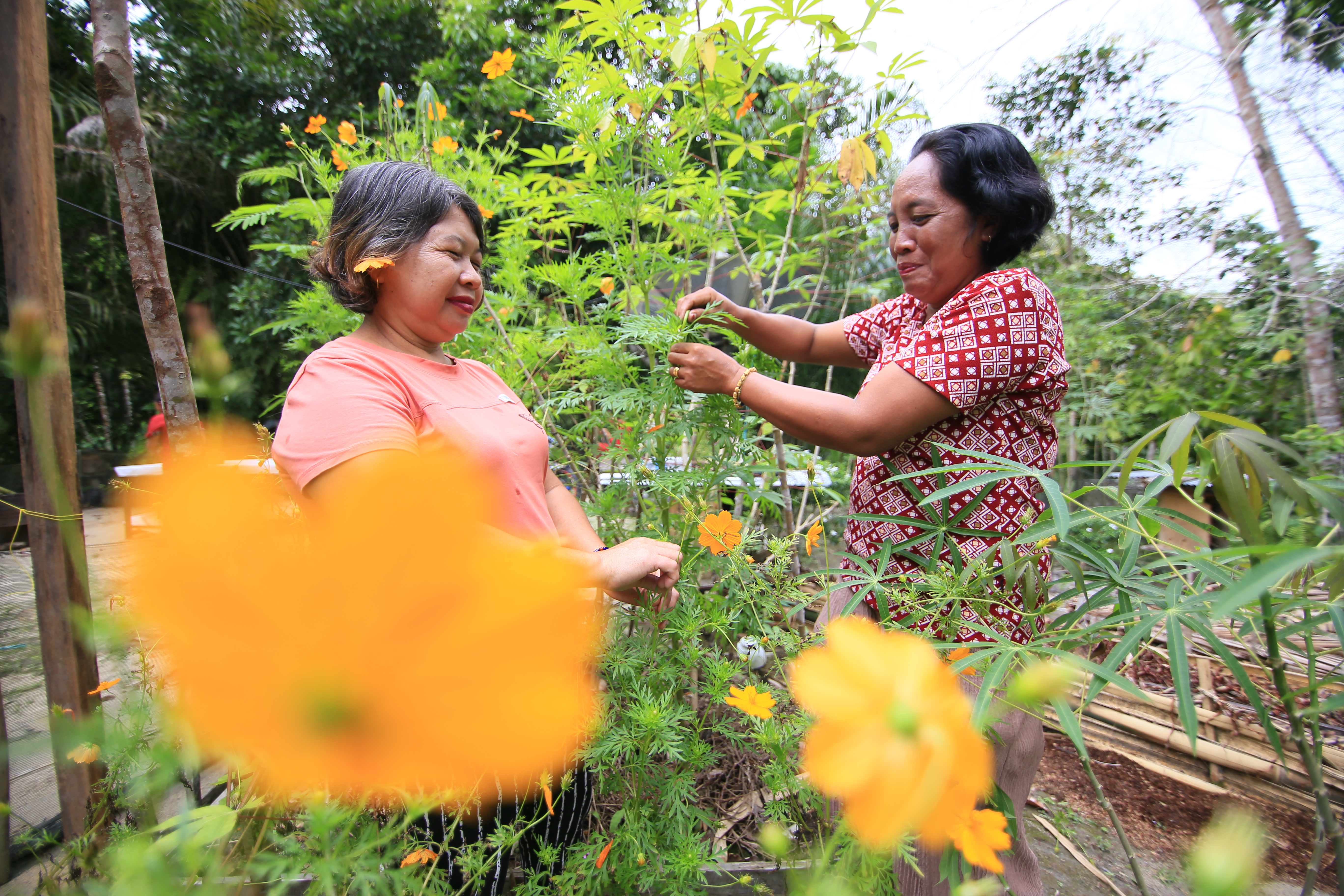 Women are at the forefront of forest protection, conservation and restoration. They work in difficult environments, often trekking for hours through mud on motorbikes or through the jungle on foot. We work with and support a number of inspiring, brave women who fight fires, collect seedlings for reforestation projects, care for and then replant the seedlings. They also work with and teach local communities about how to care for the forest and they teach and encourage environmentally friendly farming and gardening techniques. Below are two women with our partner Borneo Nature Foundation in a permaculture vegetable garden in Borneo.