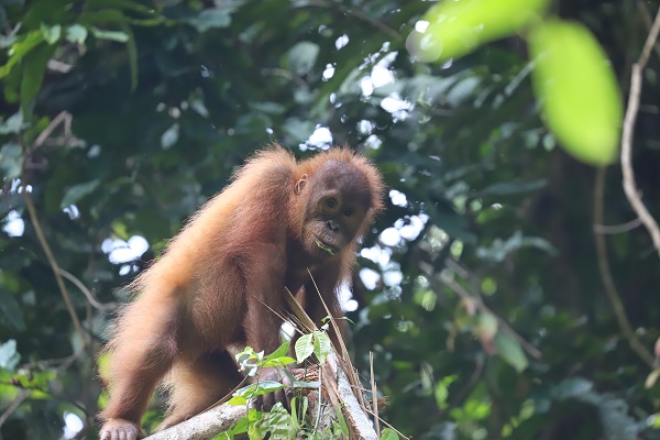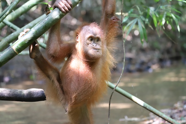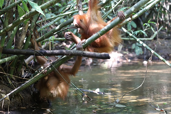 Sudin is excellent at foraging for forest fruits during Jungle School and has been eating many fruits lately including liana, sangkuang, ludai, and aro (Ficus sp). Sudin and Siti also like to play in the bamboo groves at the river. They are learning to eat bamboo shoots and how to drink safely from the water. Sudin still needs to develop his nest building skills. He will often sleep with Siti in nests that she has made and luckily, she doesn’t seem to mind- for now.